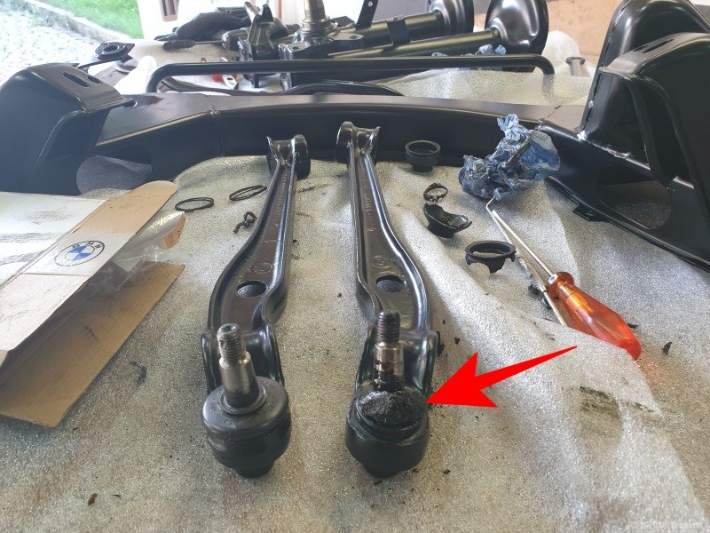Nun wollte ich die erneuern und finde dabei unter den Kappen Reste von etwas anderem (Pfeil). Ich vermute, das war der Vulkollanring an den ich nicht gedacht habe und der nun auch ersetzt werden muss. Gibt es sowas noch, oder kann ich den Querlenker jetzt komplett zum Altmetall geben?