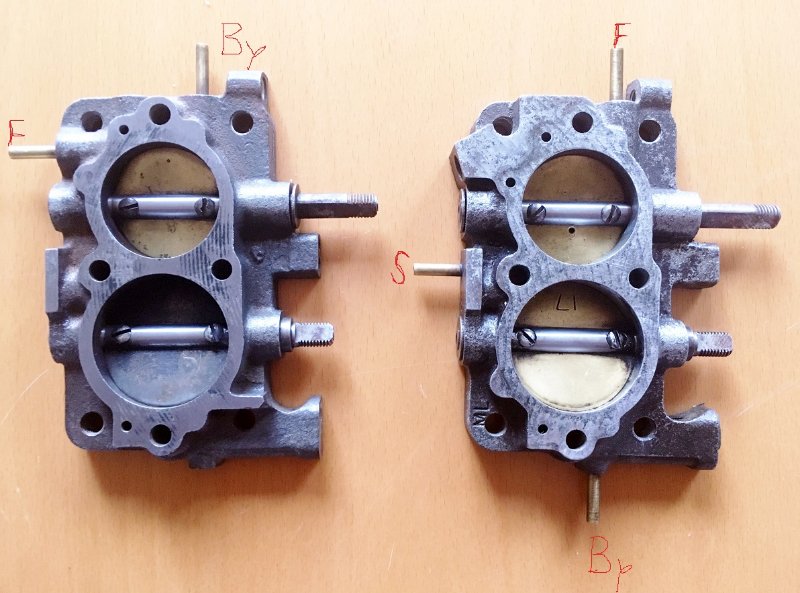 Der vordere Vergaser (also Vergaser 1) hat drei Schläuche für F und S und By angeschlossen.Der hintere Vergaser hat die Röhrchen F und S blind,dh. mit einem Schräubchen verschlossen.