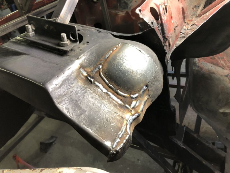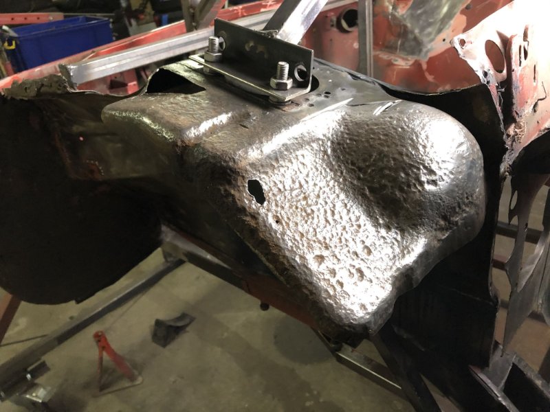 Bei der Federbeinaufnahme war aufgrund der Dicke des Bleches (3 - 5mm) das ich verwendet habe ein Dengeln ziemlich schwierig, weshalb ich dort einzelne Bleche im Tetris - Style angefertigt und ordentlich verschweißt habe. Stabil ist das jetzt auf jeden Fall wieder.