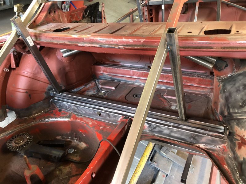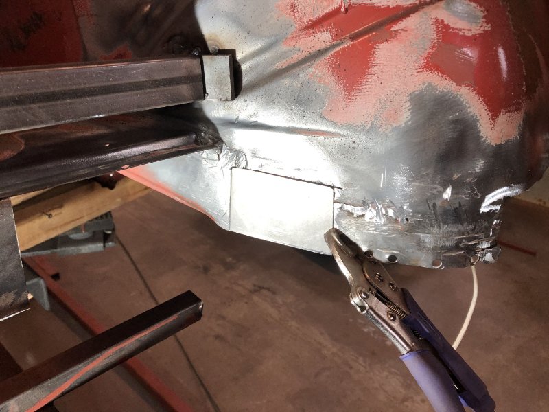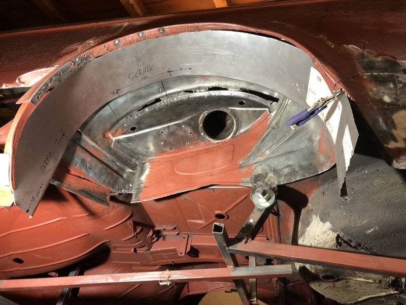 Ja, seit vorgestern ist das Blech auch drin. Zum Einpassen habe ich dann auch noch die Rückleuchten zur Hilfe genommen und wo es ging die Punktschweißzange verwendet. Das ging ganz gut am oberen Rand zum Kofferdeckel und am oberen Rand der Rücklichter der ja mit dem Schloßträger verbunden wird.