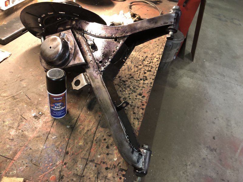 Achstraverse von alten (und eingerissenen) Tonnenlagern, U-Schutz, Ölkruste und Rost befreit, dann mit Epoxy-Rostumwandler grundiert. Warte jetzt auf mein Brantho aus der Sprühdose, das mit dem Pinseln (habe ich beim Schräglenker gestern ausprobiert) hat mir nicht gefallen, kommt auch wieder runter.