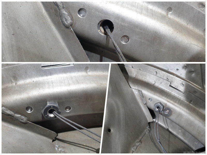 Der Draht wird soweit zurückgezogen bis der Faden im Bohrloch erscheint, dabei auf die Lage des Halter achten, die Mutter muss auf der Rückseite (!) liegen. Jetzt wird der Faden durch die Hohlschraube geführt und kann in die Mutter eingedreht werden. Die Schraube nicht zu fest anziehen, sie ist durch die Bohrung stark geschwächt und kann ggfs. abreissen. Das Zusatzblech sollte in den beiden Schweißlöchern gut zu sehen sein und satt anliegen. Den Schweißpunkt an der gegenüberliegenen Seite des Fadenlochs zuschweißen (die Hitze könnte sonst den Faden schmelzen lassen). Den Knoten im Faden lösen und Faden herausziehen.