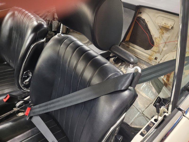 Der 3-Punkt Festgurt für die Vordersitze nimmt die obere Mutter am hinteren Radlauf, die Mutter unten an der B-Säule und die an dem Kardantunnel.