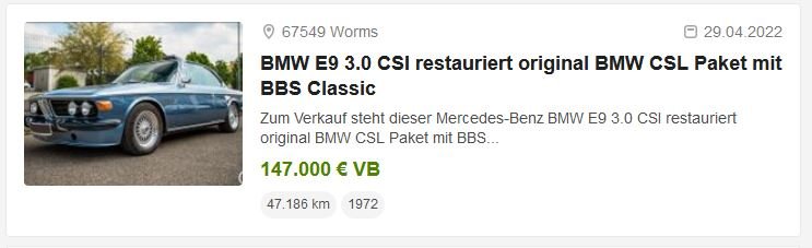 hier mal wieder etwas unterhaltsames, ein restaurierter 3.0 CSi mit originalem BMW CSL Paket und BBS Classic in der Bucht bei den kleinen Anzeigen für günstige 147.000 VB und parallel auf der Auktionsplattform https://www.kickdown.com/de/postings/01 ... 7549-worms.