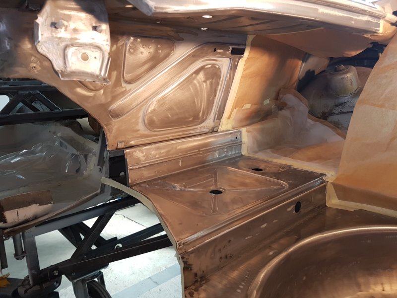 Auch auf der rechten Seite musst du die getriebeaufnahme saniert, entlackt und lackiert werden. Genauso wie auf der anderen Seite wurde hier der äußere Teil der Spritzwand erneuert eingeschweißt und lackiert werden.