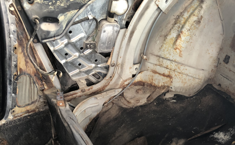 Konnte nach einiger Zeit wieder weiter arbeiten und habe hinten alles ausgemistet. Sieht nicht ganz so schön aus, am liebsten würde ich mit dem Sandstrahler durch.An den meisten Stellen ist der Rost nicht so extrem Tief, aber recht schwer zugänglich, gerade zur Außenwand hin, unterm Fensterheber. Wie geht man hier denn am schlausten vor, ich tendiere immer noch dazu,daß ganze so minimalinvasiv wie möglich zu machen, nur raustrennen, was wirklich nötig ist.