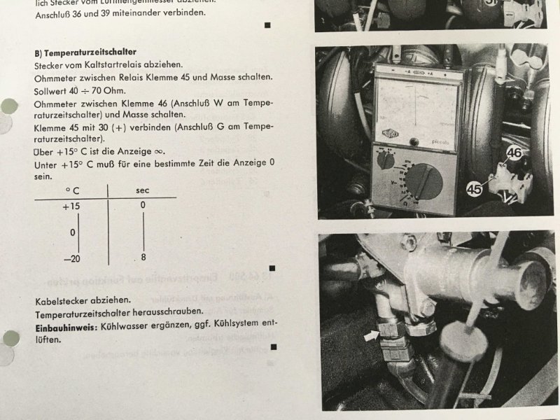 Des Weiteren zeigt mir der Thermozeitschalter bei beiden Klemmen keinen Widerstand an (Prüfspitzen W an Masse, G an Masse) – heißt dass dieser kaputt ist? Prüfschema wie hier https://www.senatorman.de/d-jetronic.htm unter 9b