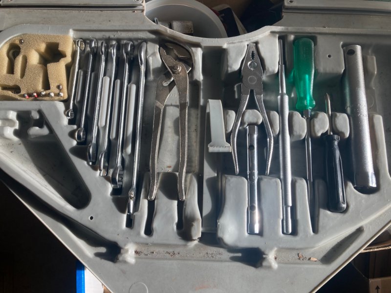 Das folgende Bild zeigt einen Werkzeugkasten aus einem E24 M6 Baujahr 84. Ich denke mal bis auf die Wasserpumpenzange sind alle Teile noch original. Hier wurde dann schon wieder auf den Kunststoffschutz verzichtet.