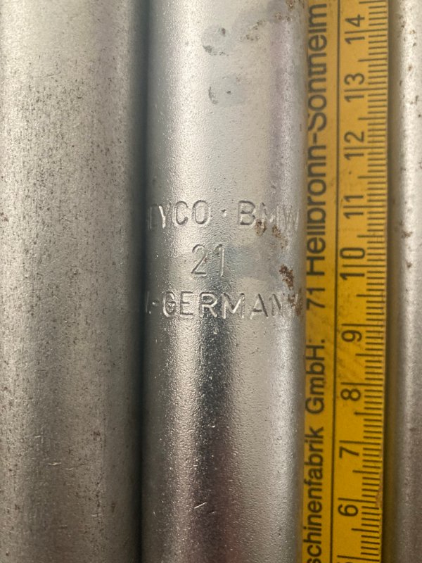 Das hellgraue Ende dient beim Radwechsel zum Zentrieren des Rades bei BMWs, die mit Radschrauben (17er Schlüssel; zB E21, E23, ...) ausgestattet sind. Der E9 hat Radmuttern (19er Schlüssel).