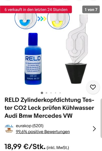 Ich habe vor meinem Urlaub noch den RELD Zylinderkopftester gekauft und heute bei mehreren Fahrzeugen einen Test gemacht. Beim E9 war die Flüssigkeit blau, beim E30 ebenfalls, aber bei meinem 501 (Barockengel) Bj. 1956, da hat sich die Flüssigkeit leider auf gelb verfärbt.