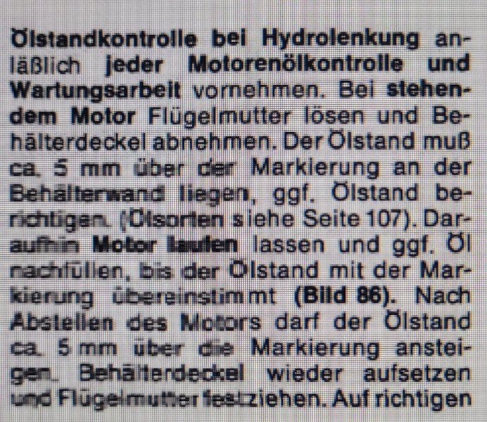klar, aber wenn du die Lenkhydraulik entlüftest, musst du bei laufendem Motor die Lenkung hin und her drehen, um die Luft rauszubekommen. Danach kann es sein, dass der Flüssigkeitsstand abgesunken ist und ich muss nachfüllen. Also kann ich dabei gleich den Deckel auflassen und nicht immer auf und zudrehen.