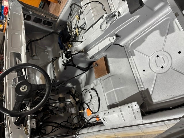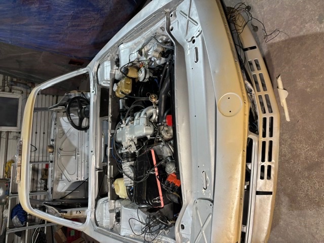 In den letzten Tagen habe ich wieder ein wenig schrauben können. Die Kardanwelle und die Auspuffanlage sind montiert. Getriebe–und Verteilergetriebeöl gewechselt sowie Servolenkung. Kühlflüssigkeit eingefüllt und anschließend alle Leckagen beseitigt😂. Fast alle Kabel haben ihre Bestimmungen gefunden. Demnächst werden noch die Haube, Kofferraumdeckel und Türen montiert. Dann kann er zum Lackierer.