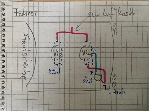 Hallo Andi! Das hatte ich schon fast vermutet das mit einem T Stück die beiden Anschlüsse der Vergaser der Seite zum linken Kotflügel verbunden werden. Geht das Schlauchstück vom T Stück weg dann zur Früh- oder zur Spätverstellung am Zündverteiler? Auf welchen Vergaser und auf welchen Anschluss geht dann das "Gegenstück vom Zündverteiler d.h. Früh- Spätverstellung" drauf? Wo geht vom Luftfilter der Schlauch drauf? Was ist bei deinem Fahrzeug an den anderen Anschlüssen angeschlossen?