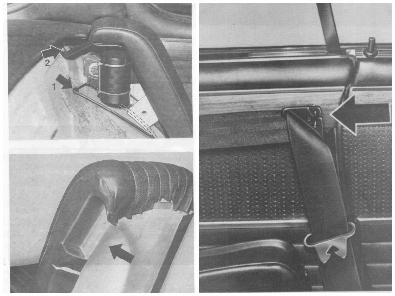 Hier die Bilder aus den Service Informationen, die die Nachrüstung der versteckten Gurtrolle für die Vordersitze zeigt. Ich habe allerdings auch noch ein Bild gefunden, in dem die Gurtrolle an Punkt 3 befestigt wurde. Hier geht dann der Gurt von der Rolle (Punkt 3) als Beckengurt zu Punkt 2 und dann über die Schulter zum Umlenkpunkt (UL) und weiter zu Punkt 1. Zuletzt noch die Teilenummern der verschiedenen Gurte und deren Verwendung in USA und Europa.