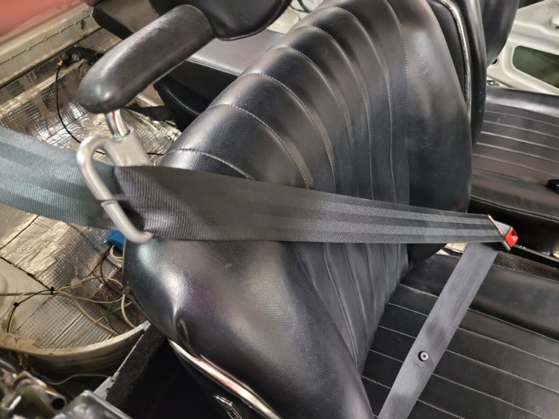 Der 3-Punkt Festgurt für die Vordersitze nimmt die obere Mutter am hinteren Radlauf, die Mutter unten an der B-Säule und die an dem Kardantunnel.
