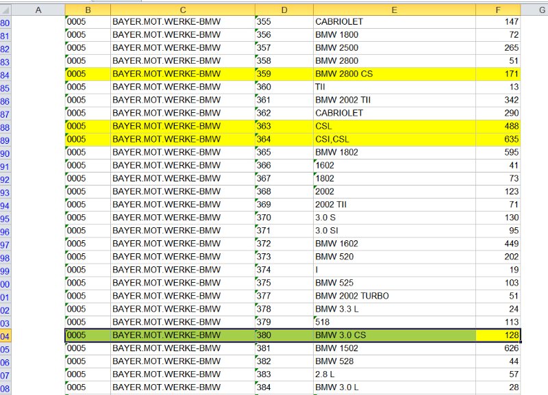 Genau. Das ergibt sich ja auch aus der Historie. Wie hätte man einem Neuwagen 2800 CS Baujahr 68 auch eine Typenbezeichnung 3,0 CS geben können wo es diesen 3,0 CS noch nicht mal gegeben hat. Ab 71 hießen dann die Coupes 3,0 CS mit erteilter KBA Typschlüsselnummer 363. Es wurde dann aber noch mal eine neue KBA vergeben, als der 3,0 CSi gebaut wurde, und diese hieß dann KBA 364. Der 2,5 CS, der auf dem Typenschild ebenfalls noch 3,0 CS hieß, bekam dann natürlich auch wieder eine eigene KBA, nämlich die 380. Die CSL hatten parallel immer die gleiche KBA wie das "schwere" Coupe.