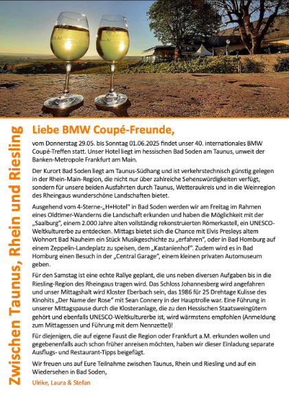 Das 40. internationale BMW Coupe-Treffen findet dieses Jahr vom 29.05. - 01.06.2025 in Bad Soden statt.
